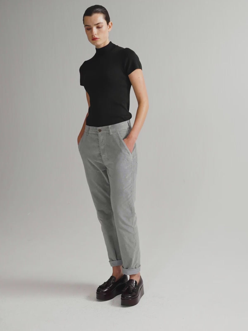 Relaxed soul, refined texture. Leyla brengt het comfort van je favoriete broek samen met de zachte luxe van velvet. De fit is gebaseerd op onze geliefde Andrew pants: een middelhoge taille, rechte pijpen en een iets nonchalante, taps toelopende snit. Gemaakt van een zachte, geruwde velvet kwaliteit met lichte stretch voor extra draagcomfort. De broek heeft rechte steekzakken voor, opgestikte zakken achter en is afgewerkt met riemlussen, een jeansgulp en subtiele goudmessing details. Rol de pijpen nonchalant op voor een modern effect of draag ‘m voluit met een oversized knit – Leyla beweegt moeiteloos tussen casual en chic.