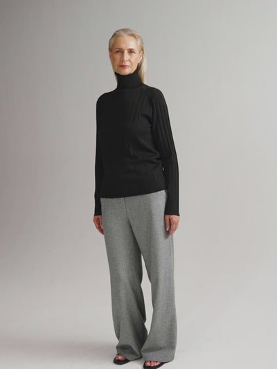 Liselotte is a turtleneck that masters the subtle play of form and refinement. Knitted in a wide rib structure, it elongates the silhouette and adds a graphic rhythm. At the hem and cuffs, the rib narrows into a fine rib trim – a detail that quietly marks the transition. The collar is crafted in a smooth plain knit: supple, soft, and elegantly draping around the neck. The fit is gently slim, following the lines of the body without constriction. Liselotte is made from our sustainable Seawool blend, with the look and feel of wool but without the itch – wearing like reassurance.
